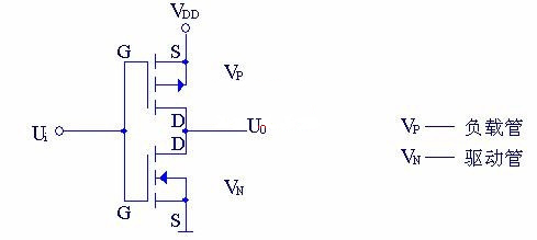 CMOS反相器電路組成圖文分析CMOS反相器電路圖1 CMOS反相器電路(1)工作原理①輸入低電平 Ui=0 時 VN截止, VP導通 Uo≈VDD②輸