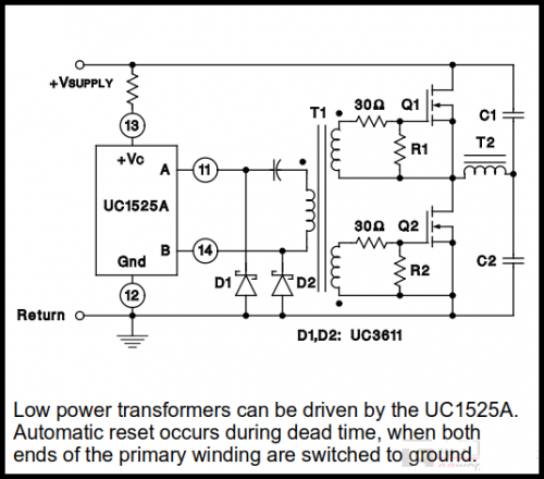 變壓器驅動半橋電路結構分析圖(01)是 Unitrode 公司(已被德州儀器公司并購)生產的 UC1525A(與 UC2535A、UC3525A 相同,三個型號僅工作